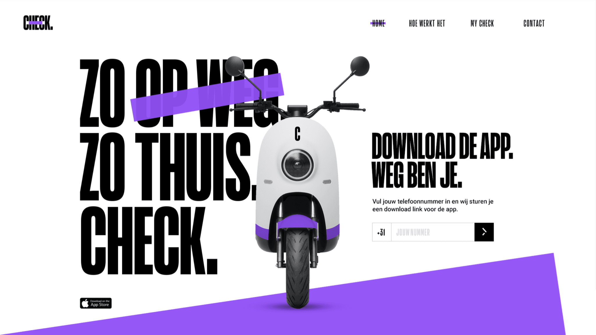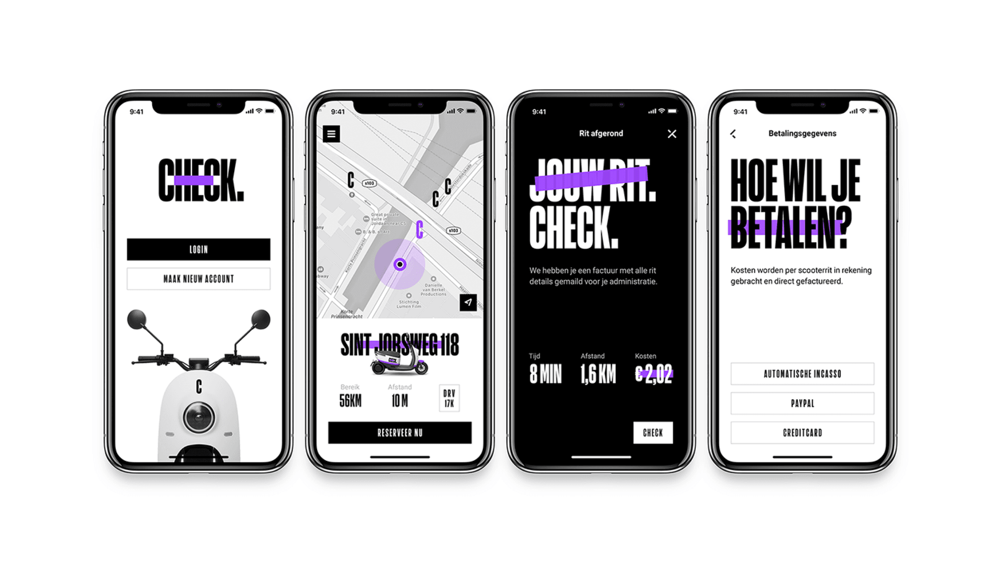 With Check’s app, scooters and helmets as the three essential touchpoints we designed for impact and experience. All captured in a simple but standout color palette, a bold but stylish typeface and a welcoming but energetic tone of voice. Standing out of the competitive crowd? Check. Outgrowing the competition? Check.