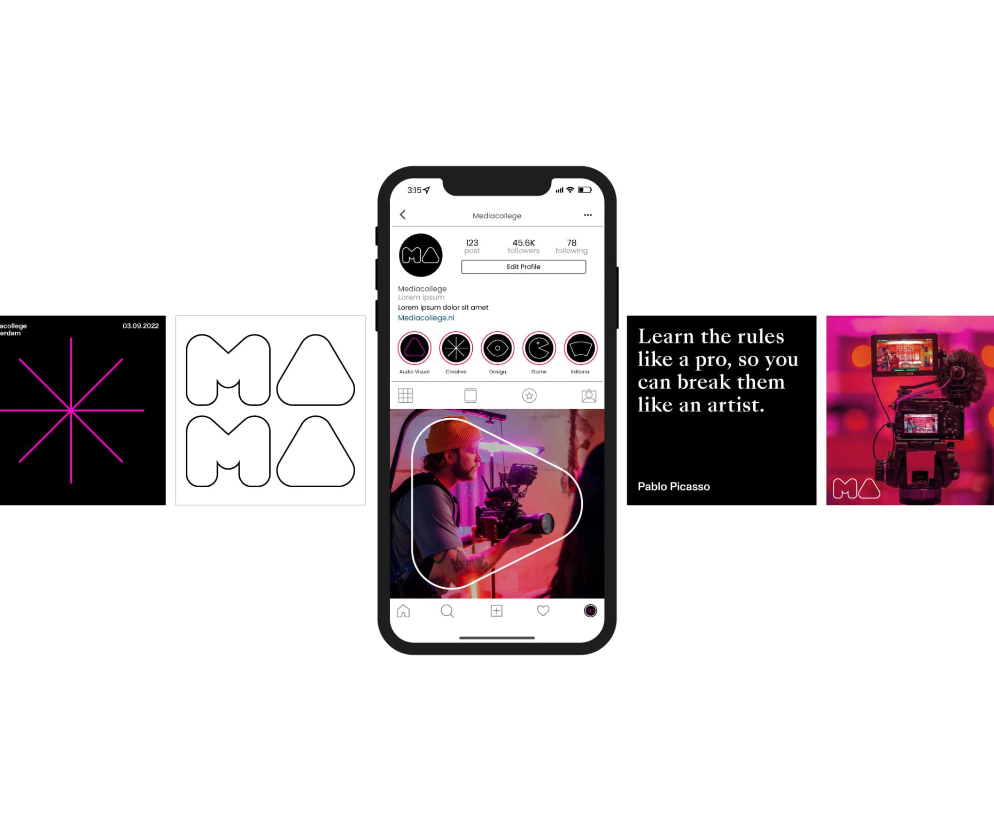 The triangle shape forms the basis of a dynamic shape library showcasing the diversity of the schools offering. Just like its curriculum, the Ma visual world is ever-changing. The students’ work sits at the core of the visual language: all imagery used is either student work or behind the scenes footage of students crafting the work.